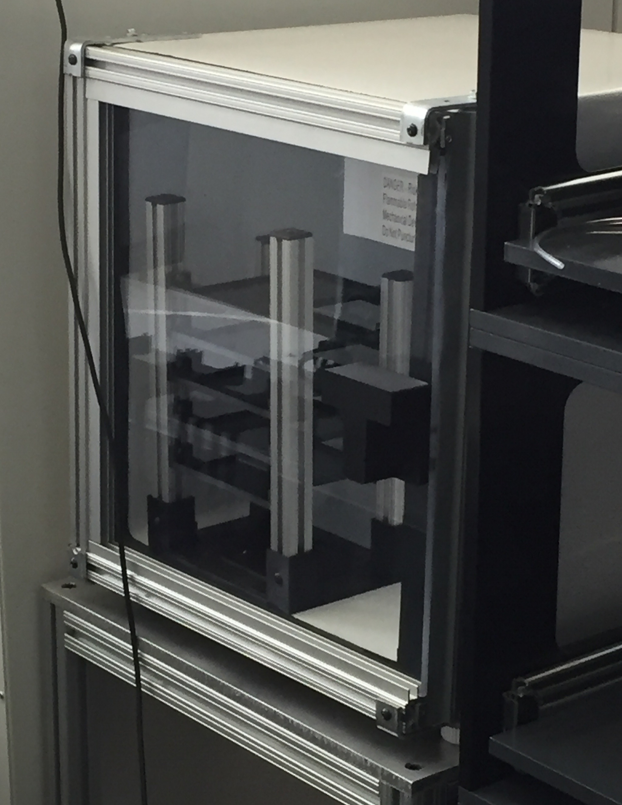 The goal of this project was to create a fully automated fridge that the robot arm could place and remove plates from. A mini-fridge door was replaced with a sliding door so that the robot arm could slide it open and closed. The hotels and shelves were made from 3D printed PLA. This served as a cheap alternative to laboratory automation fridges that can cost upwards of $50,000.